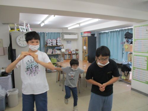連日の猛暑の中、外での活動が難しいので室内で運動できるよう職員も様々な工夫をして過ごしていました。