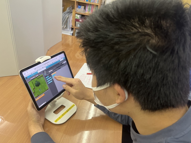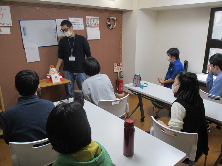 写真は、年始に鏡開きについての説明を受ける地域活動支援利用者の様子と、新たにプログラミング(初心者用)に取り組んでいる放課後等デイサービス利用者の様子です。
