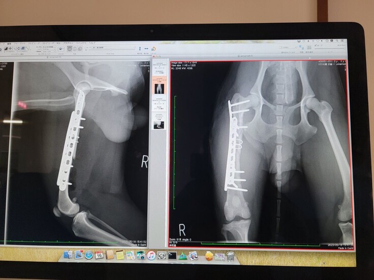 5月8日・病院でレントゲンを撮ってもらうと、右後脚大腿部が3か所複雑骨折をしていることが判明しました。かなり難しい手術になること、費用も高額になることの説明を受けました。