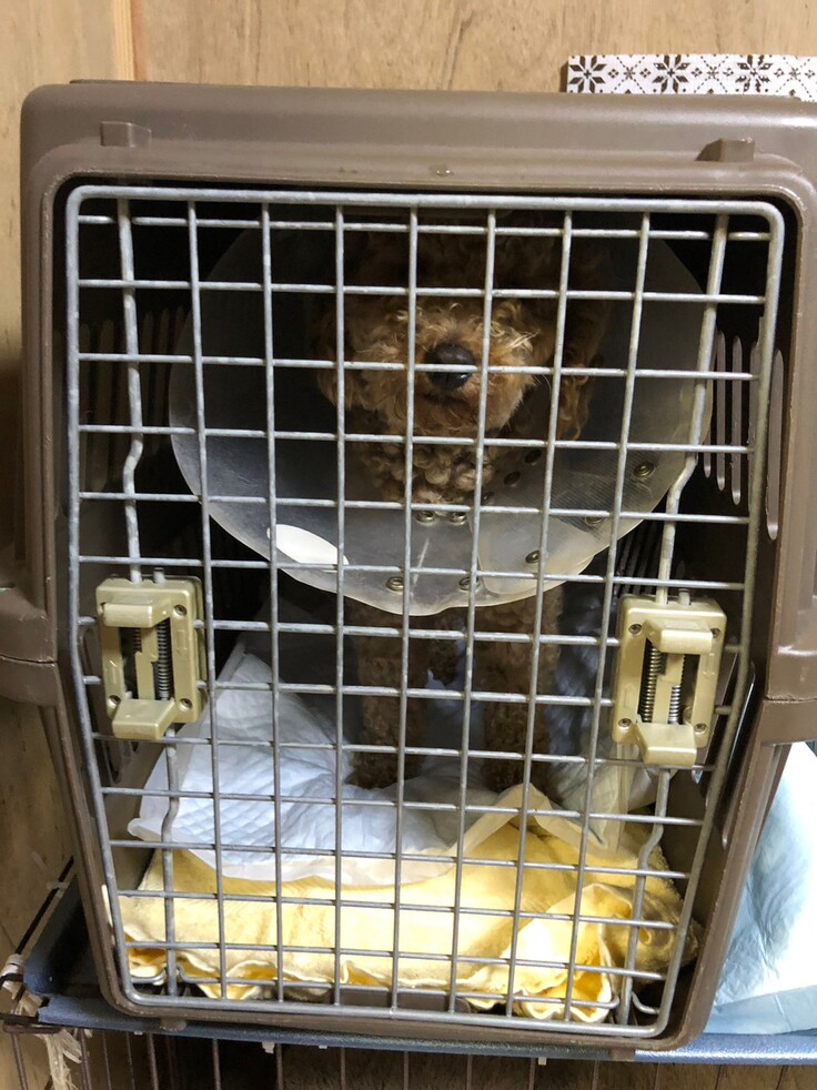 5月19日・退院。入院中のクルは再手術を受けたクリニックでもいい子にしていて、スタッフの皆さんにかわいがってもらっていて、爪も切ってもらったそうです。退院後1か月間は絶対安静。歩いてもいけないので小さめのケージに入ってもらって動かないようにします。