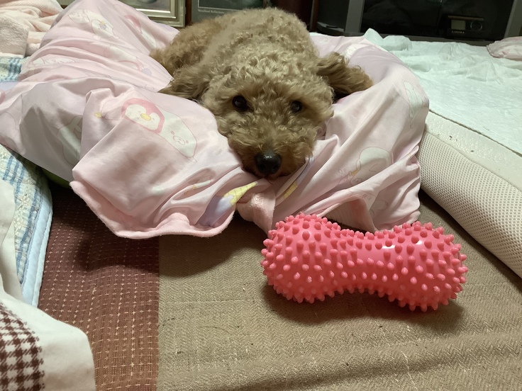 食欲はとっても旺盛で、ドッグフードの他に鶏肉、野菜、レタスやスイカも好んで食べます。おもちゃも全部持ってきて「遊んで〜」とアピールするそうです(^^)一人遊びは苦手だとか。施設にいるとなかなかゆっくり遊んであげられないので、預かりさんには本当に感謝です!このまま順調に回復していって欲しいなと思います。