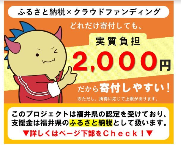 本プロジェクトは福井県が「クラウドファンディング型ふるさと納税」の対象事業として認定しています。寄附の方法は通常のクラウドファンディングと同じですが、実質負担2千円で寄附できるメリットがあります。