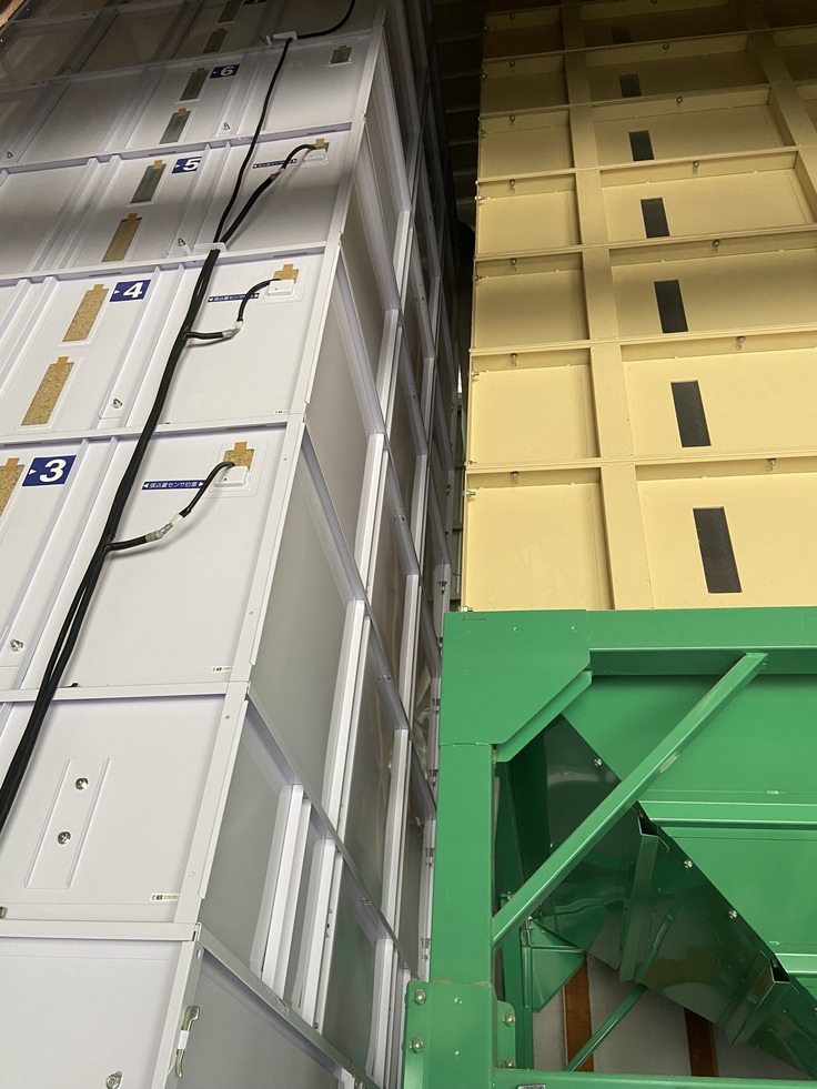 左の乾燥機にいれて、一晩乾かします。そして右側のライスプール(乾燥したもみの保管庫)に移し籾摺りが可能になります。