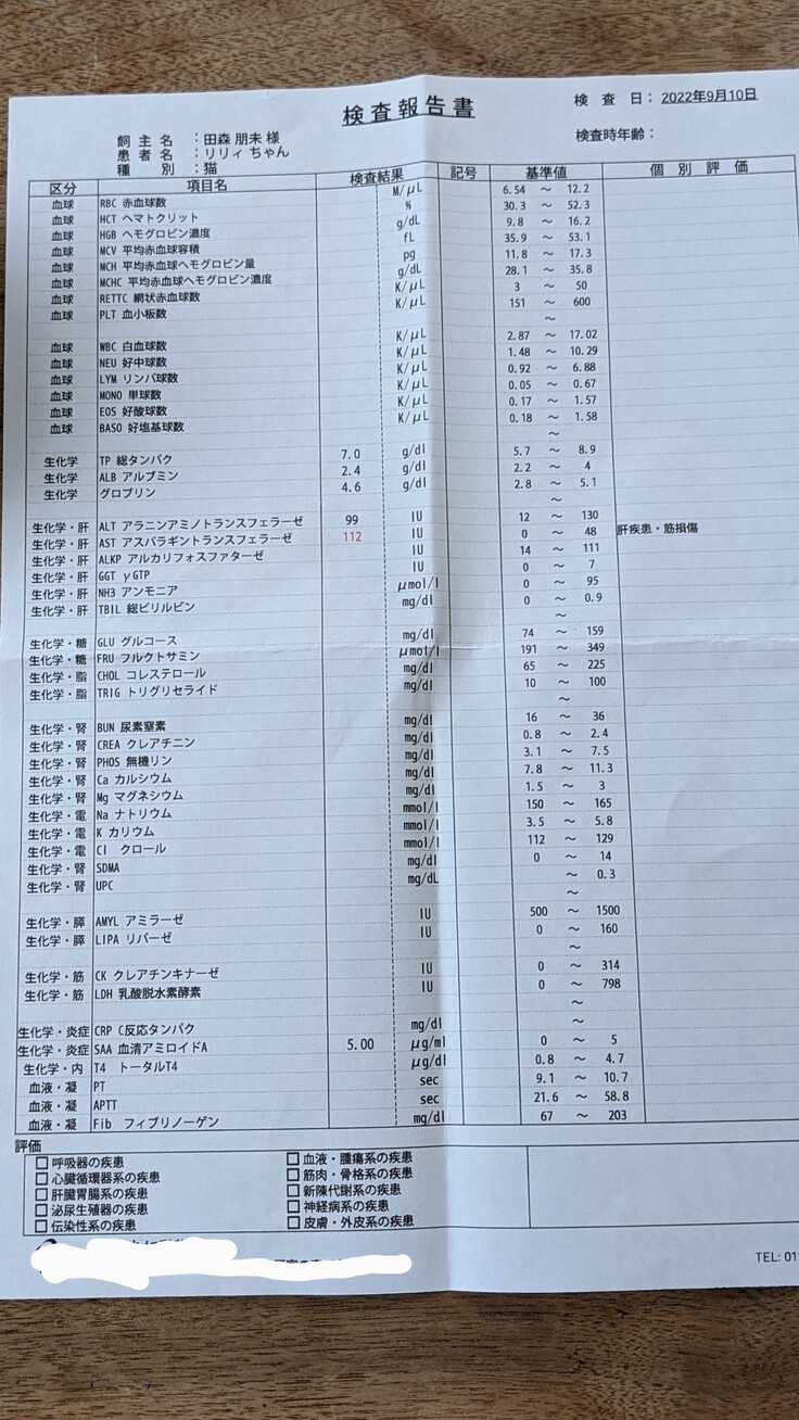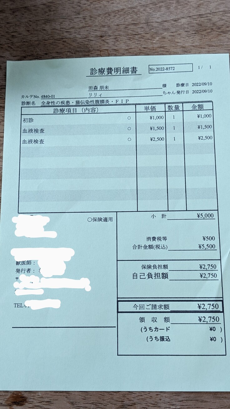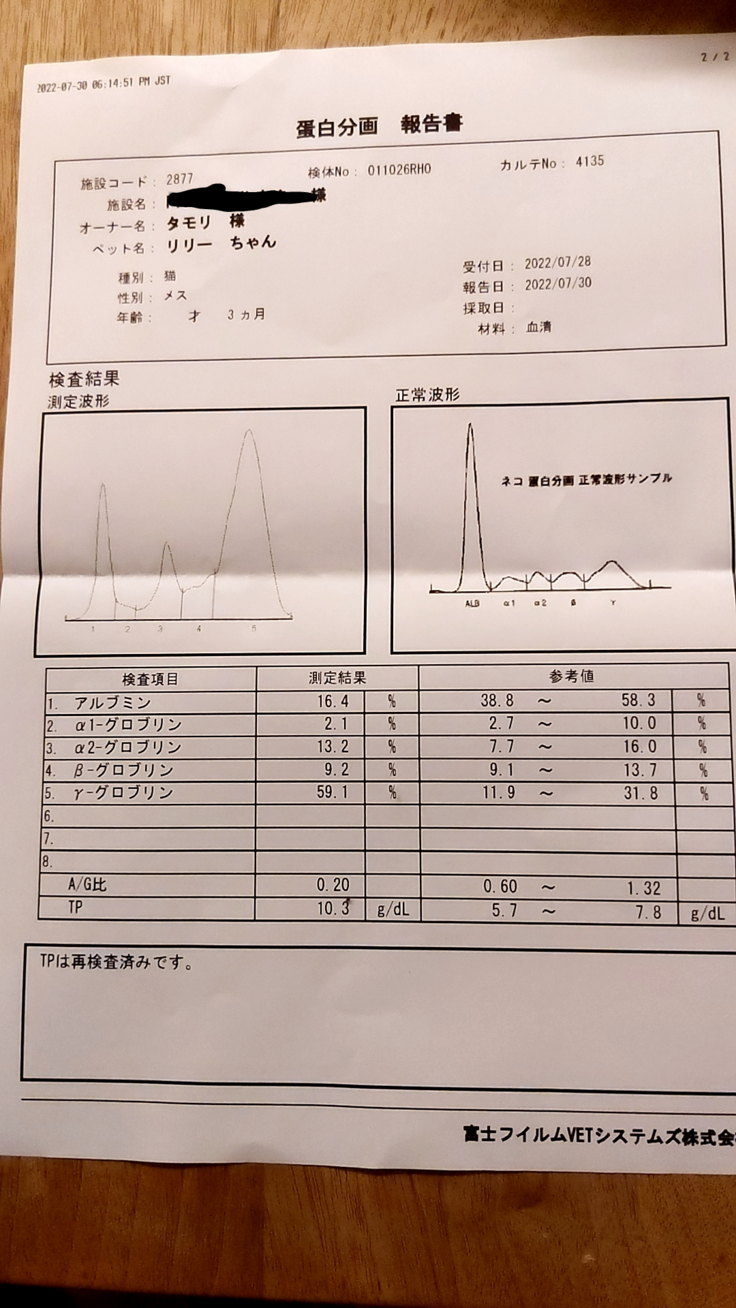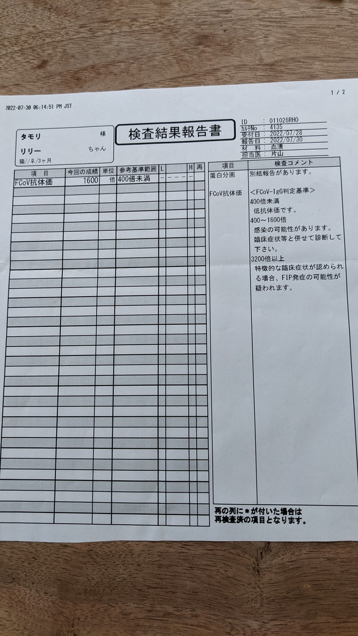心配になり保護主さんへ相談すると、FIPの検査を受けてほしいと言われ再度検査に行きました。