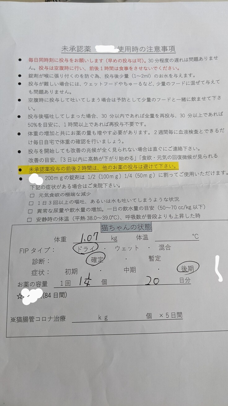 FIPに効くと言われている国内未承認薬での治療を行っています。