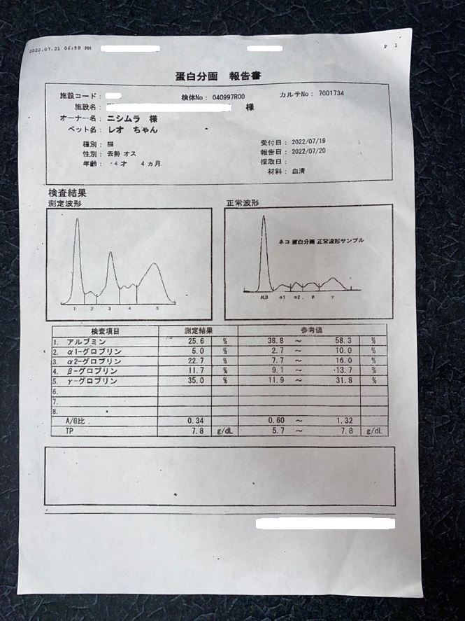7月19日:体温が40℃(猫の平熱は38℃前後)まで上がったことで、FIPの疑いの方が強くなる。より詳しい血液検査の結果、測定波形により、ほぼFIPで間違いないと診断されたが、この病院でもFIPの治療をしていないとのこと。