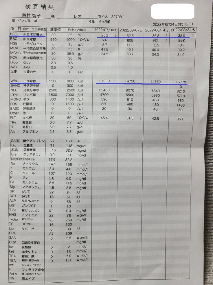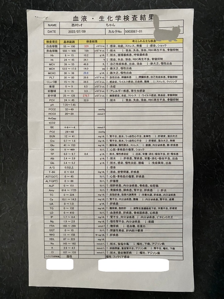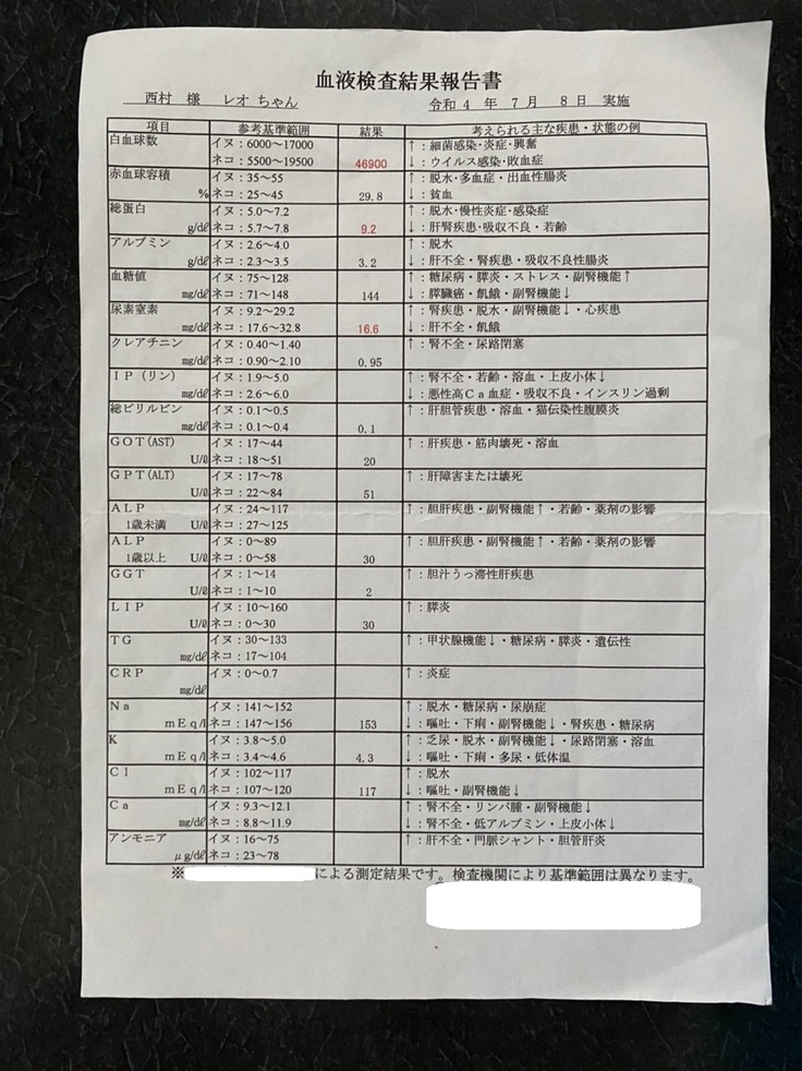 7月8日:嘔吐をし、食欲ゼロに。トイレ外に血便と思われる排便もあり、慌ててかかりつけの動物病院で血液検査。白血球が46900。総蛋白9.2。尿素窒素16.6。膵炎の疑いで大きい病院を紹介される。