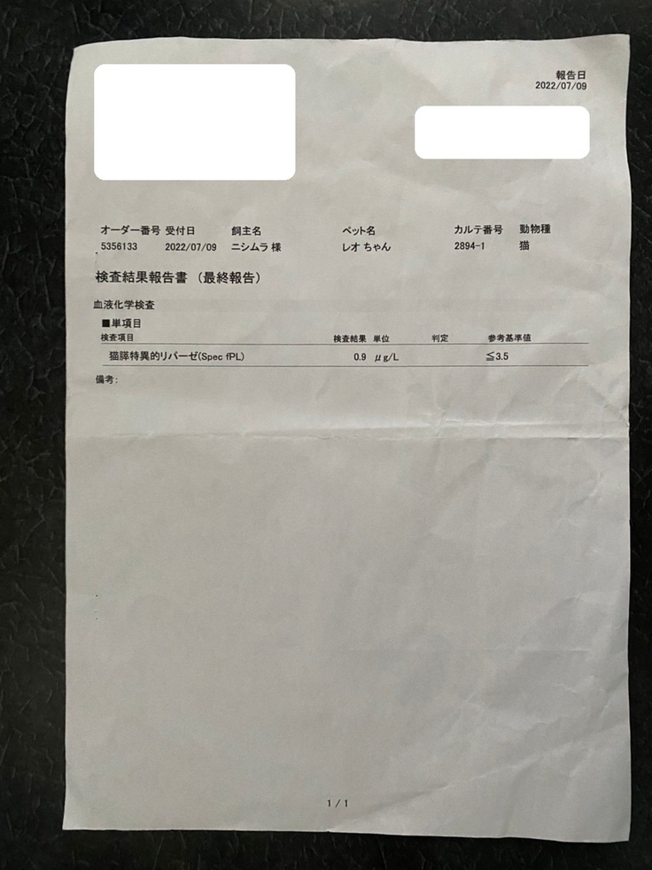精密検査の結果、疑われた膵炎ではないことが分かる。猫白血病・HIVも陰性。