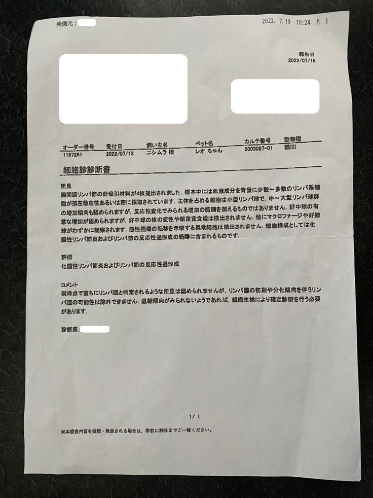 7月11日:全身麻酔をして、CT検査と腹部組織の細胞診検査を実施。結果、化膿性リンパ節炎およびリンパ節の反応性過形成という評価。
