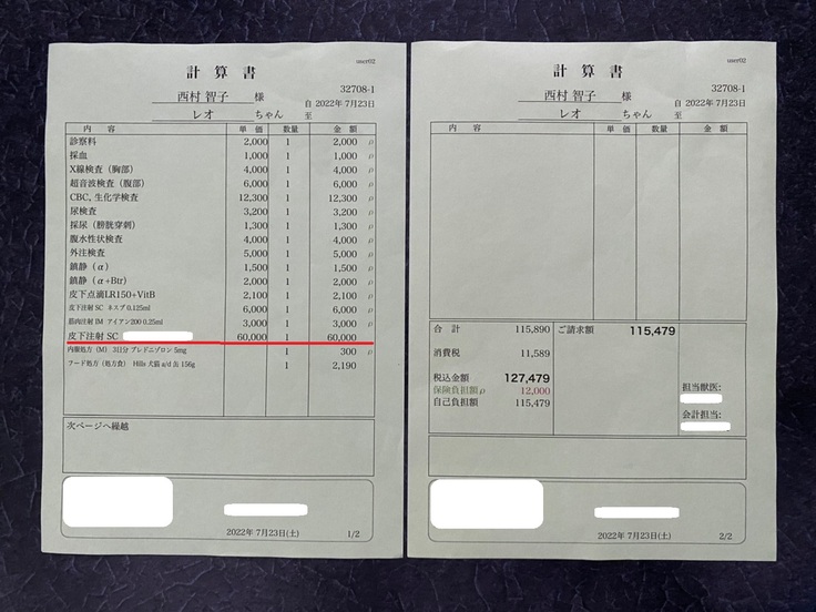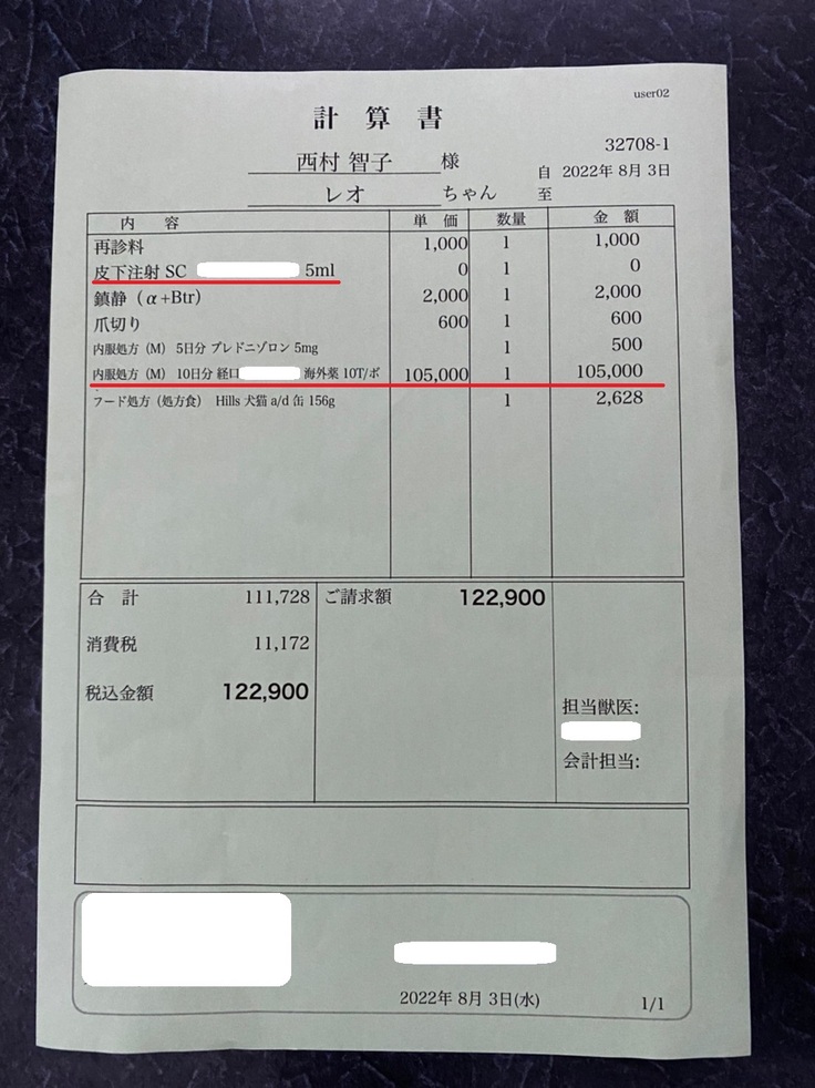 7月23日~8月3日まで12日間、治療薬(1)の投与を受けました。その後に服用する治療薬(2)の処方を含む領収書です。(赤線が治療薬の価格)