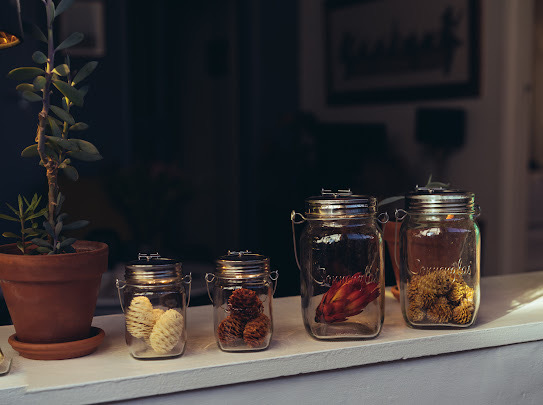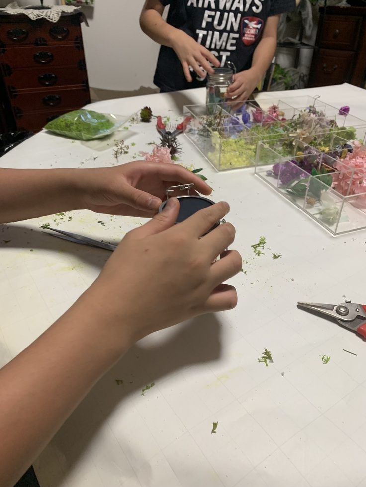 テーブル中央に沢山のドライフラワーやドライフルーツ・貝殻を用意し、ホテルの食事のバイキングのように、ソネングラスの中に入れたい物をトレーに取ってもらってソネングラスの中に入れて頂くようにしようと考えてます。