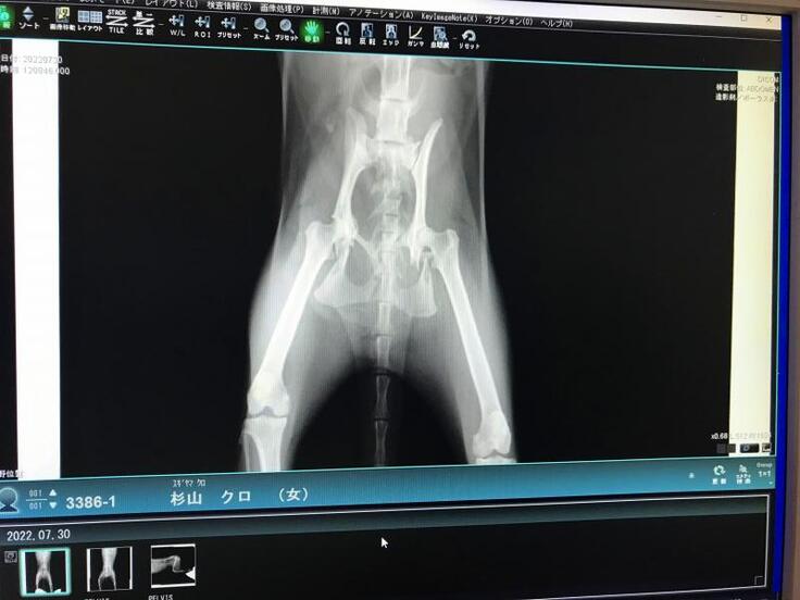 脚が立たないようなので仔猫2匹とクロちゃんを一緒に保護して動物病院で診察してもらうと、骨盤骨折していました。
