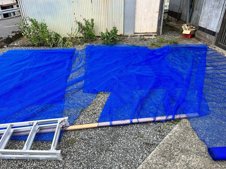 50メートル×2メートルの暴風網を、切りながら設置していきます。