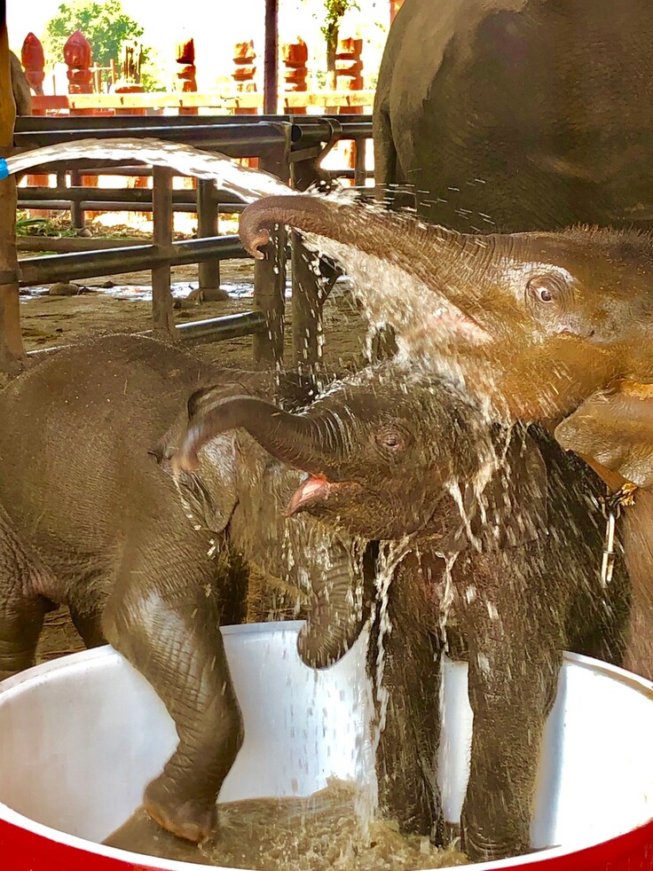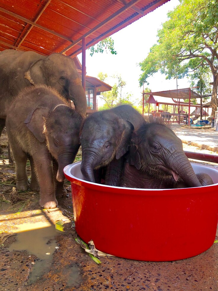 観光客とはまだ遊べないけど、そんな赤ちゃんゾウたちのためにプールをプレゼントして、