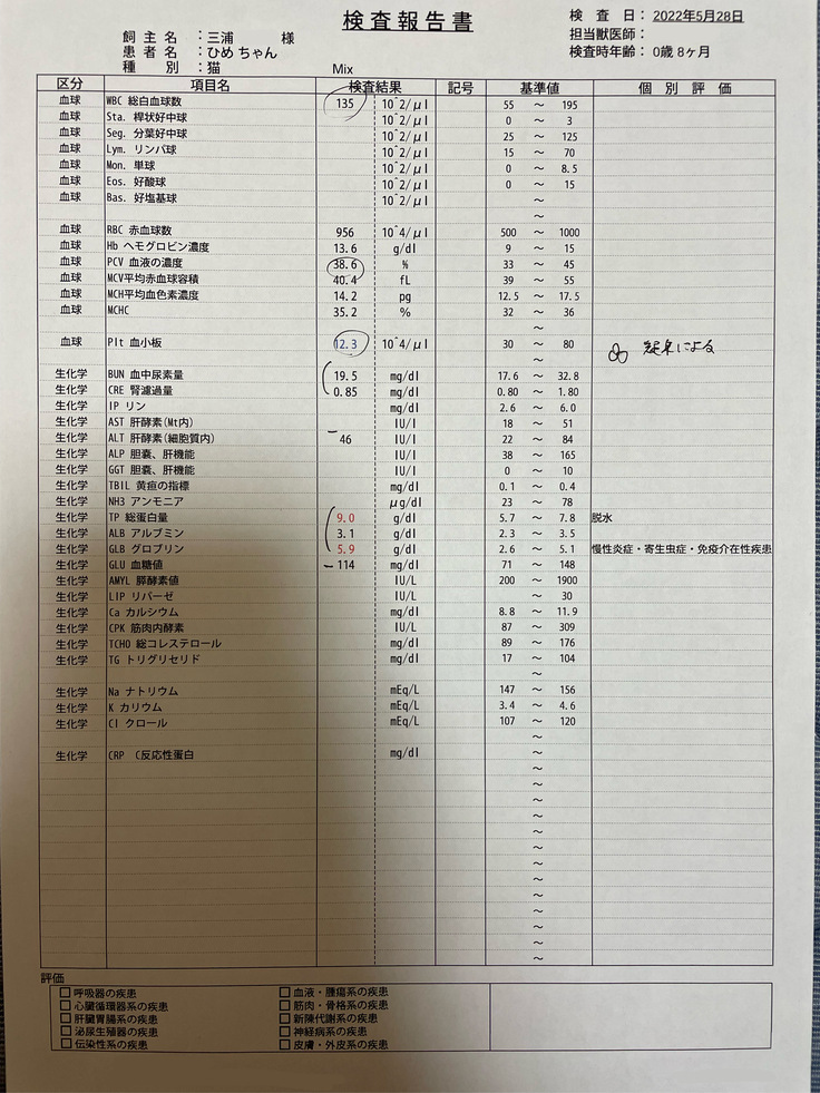 この時からタンパクとグロブリンの数値が高く注意が必要とされていたため、約1ヶ月ごとに血液検査を行うことになりました。