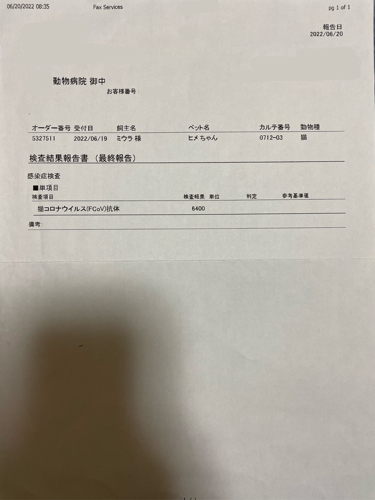 ↓猫コロナウイルスの陽性反応がでた検査結果です(※掲載許可はいただいております。)