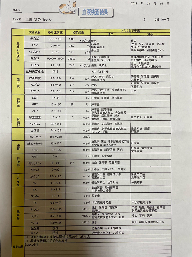 ひめは5月末に避妊手術を行いその時に血液検査を受けました。