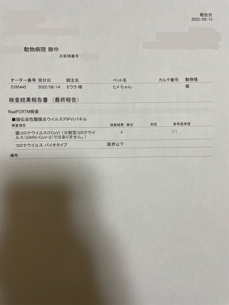 8月14日、B病院での検査の結果、FIPでほぼ間違いないとの診断を受けました。