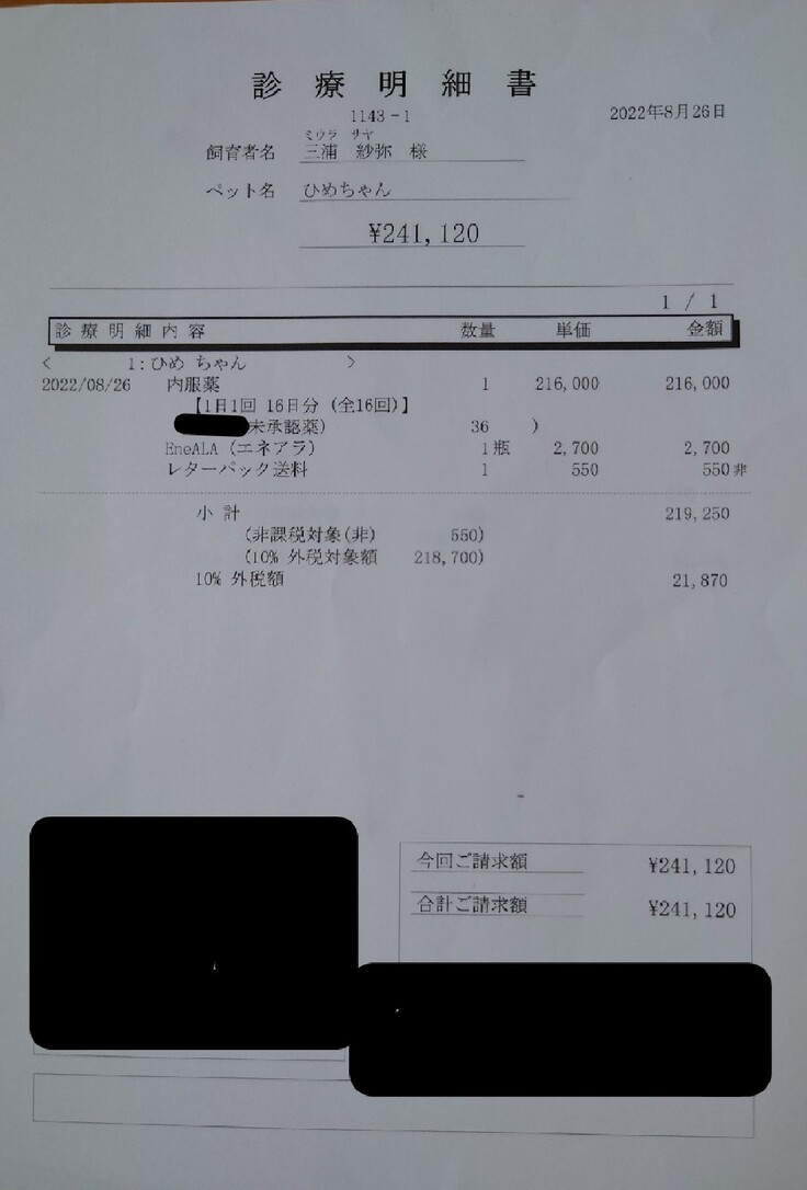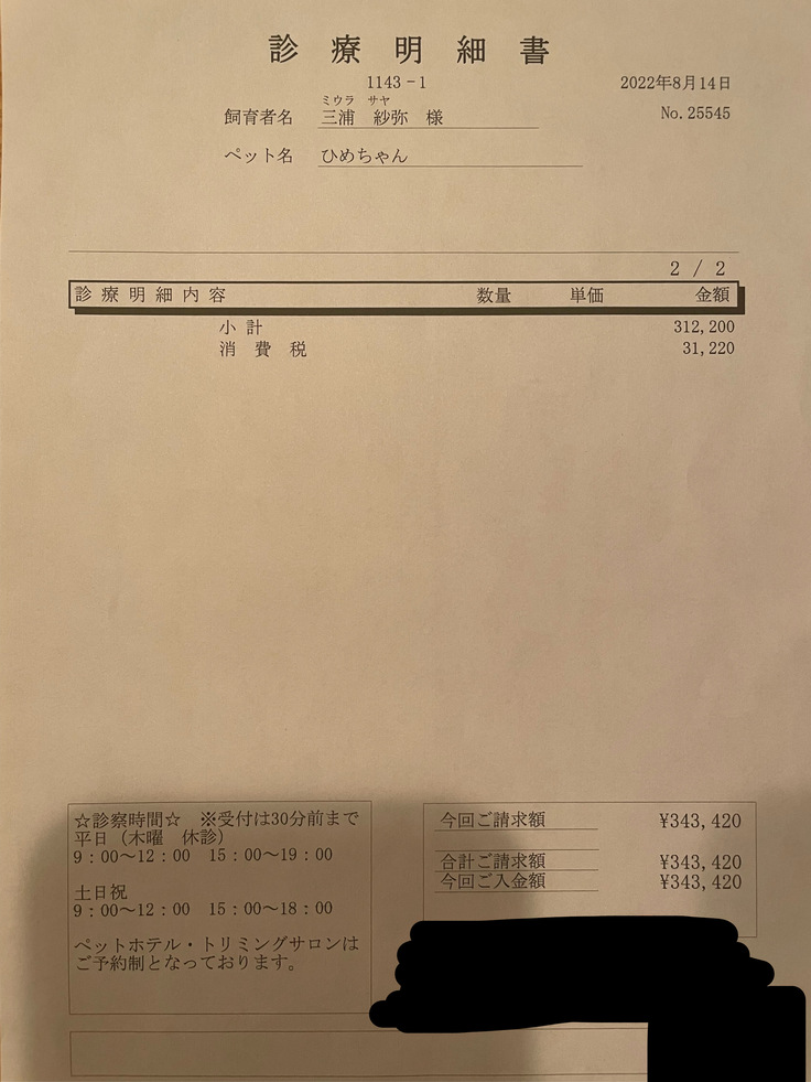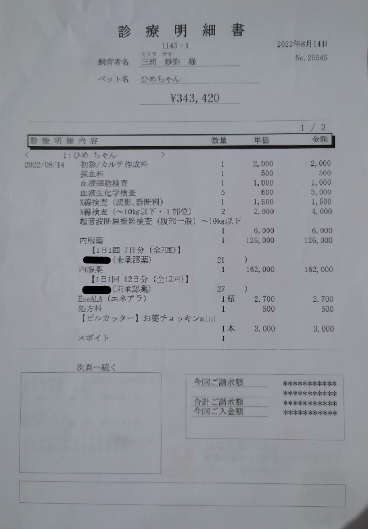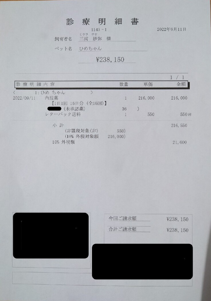 ↓その時の診療明細書です(※掲載許可はいただいております。)