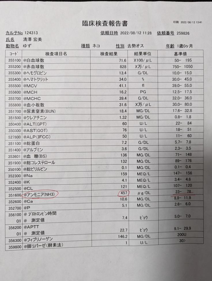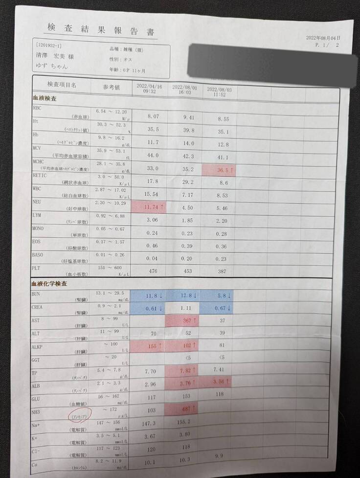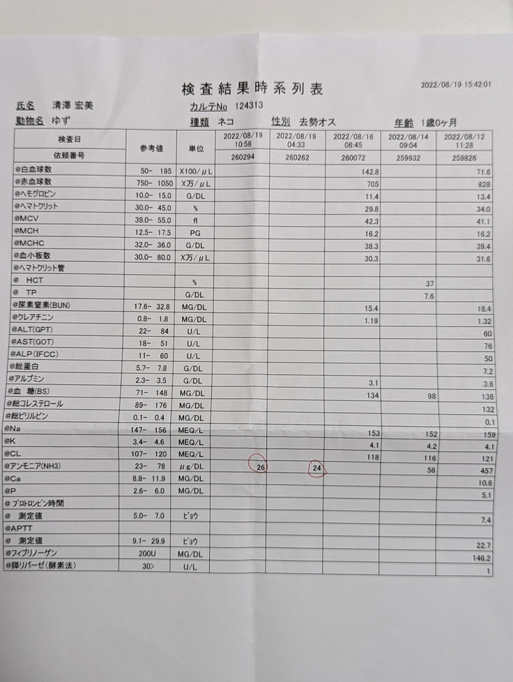 1回目の手術は無事に成功し、アンモニアの数値が手術前には687(8/1)、457(8/12)と高数値だったところ手術後(8/19)には24と正常値になりました。