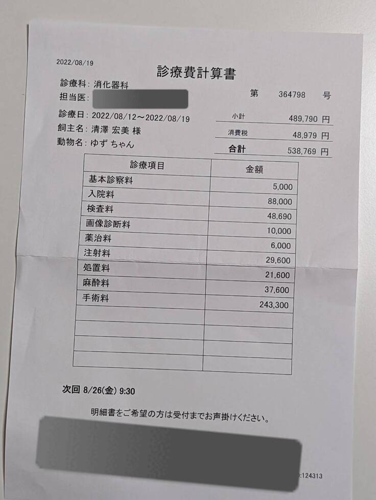 2回目の手術も術後発作がなく、スムーズにいけば前回と同じくらいの530,000円くらいだと考えています。