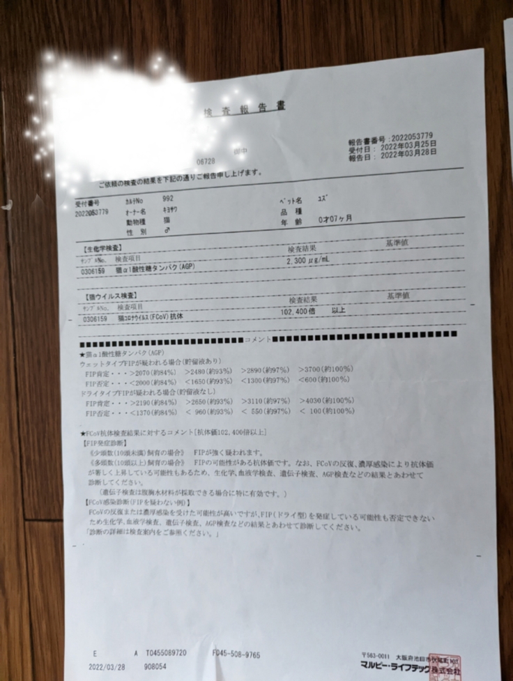 猫コロナウイルス抗体が102400倍以上と高い数値が出ました。