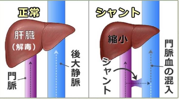 胃腸からの血液には、アンモニア、メルカプトン、短鎖脂肪酸など数多くの毒素が含まれており、適切な解毒を受けなければ体に害を及ぼしてしまいます。この解毒業務を受け持っているのが肝臓です。正常であれば、胃腸からの血液は門脈(もんみゃく)と呼ばれる専用の血管を通じて肝臓内に入り、そこで解毒を受けて全身を巡る血液循環、すなわち「体循環」に合流します。しかしシャントにおいては、門脈から体循環につながる血管に近道ができてしまっているため、解毒を受けていない血液がそのまま体循環に混入してしまいます。その結果、有害な物質が体の各所に届くようになり、様々な弊害を生み出すと同時に、肝臓が栄養失調に陥って小さく萎縮してしまいます。この状態が「門脈体循環シャント」です。