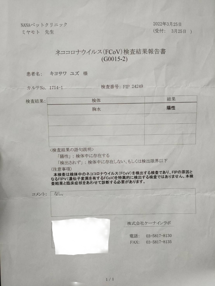 ※FIP治療と門脈シャント治療のために五か所の動物病院に行来ましたが掲載許可を得られたのはNANAペットクリニックのみでした。そのほかの病院は動物病院の希望により名称は伏せますが資料の掲載許可は得ています。