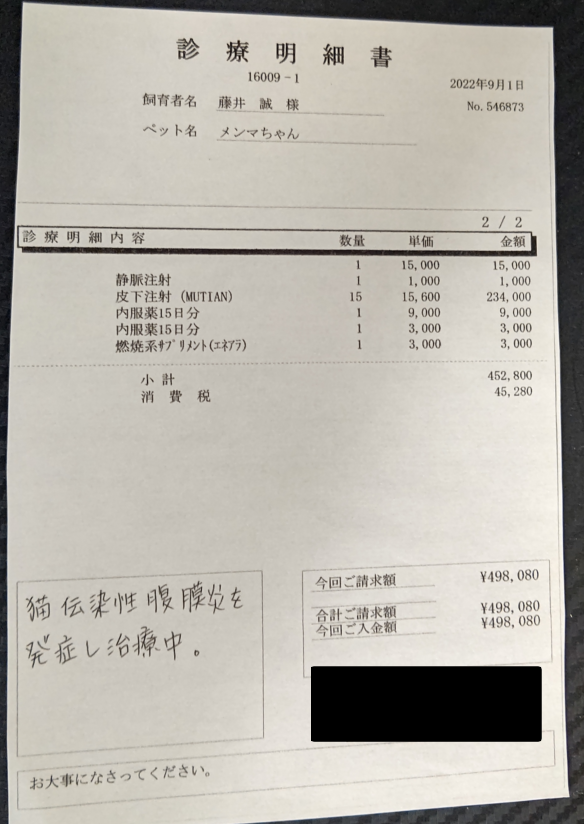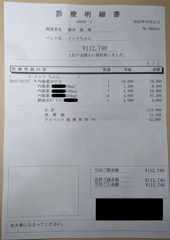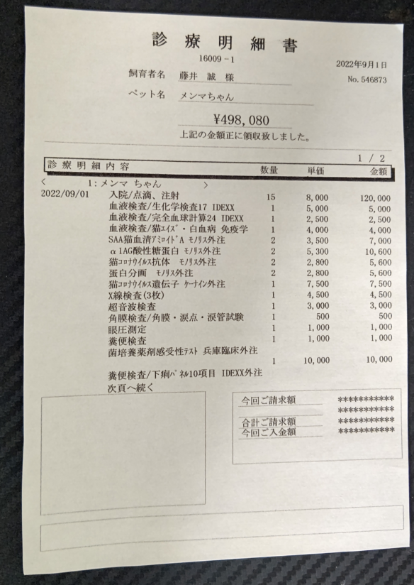 本来なら家族でめんまの治療費を支払うべきだと思います、しかし予想を上回る高額な治療費に驚きと不安が募っていきました。