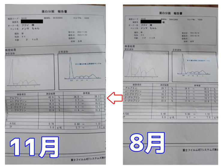 メインの記事に掲載できていなかったFIP発覚時8月と投薬終了時11月の検査結果になります。