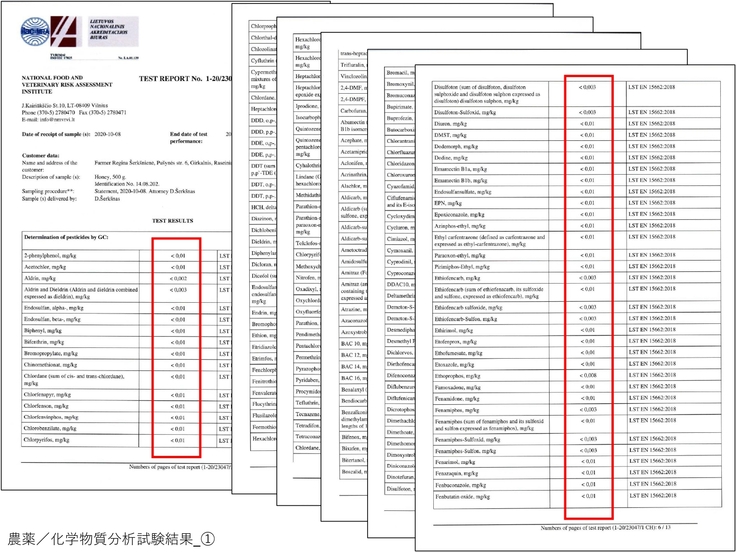 シェルクシュナス養蜂場では、農薬や化学物質は一切使用していませんが、農薬・化学物質・放射性物質の汚染がないかをリトアニア国立食品獣医学リスク分析研究所に検査を依頼し、その安全性を確認しています。2019年7月および2020年10月に実施した分析検査において農薬・化学物質・放射性物質は検出されませんでした。