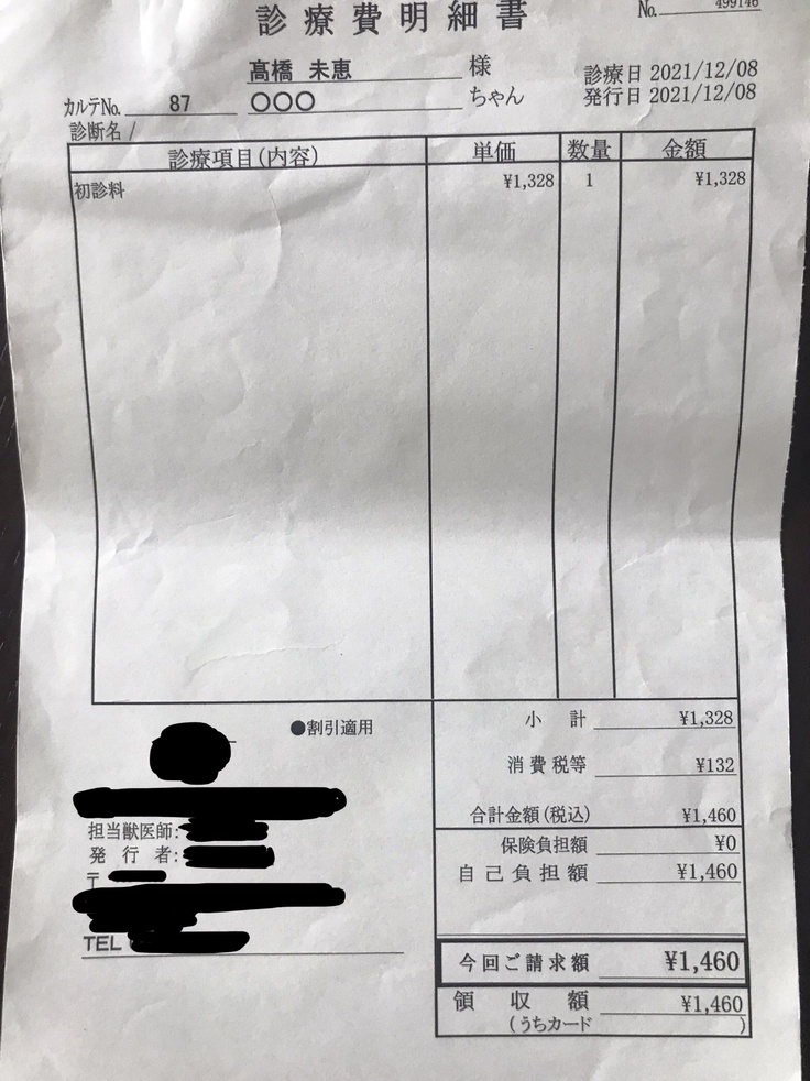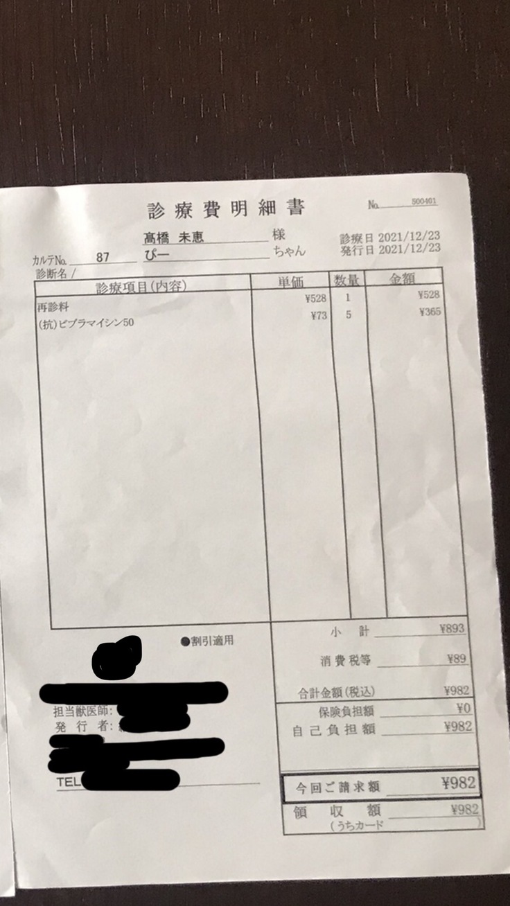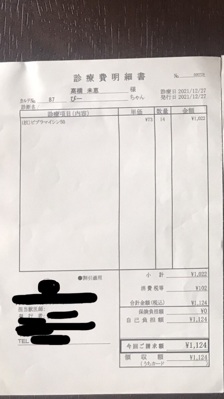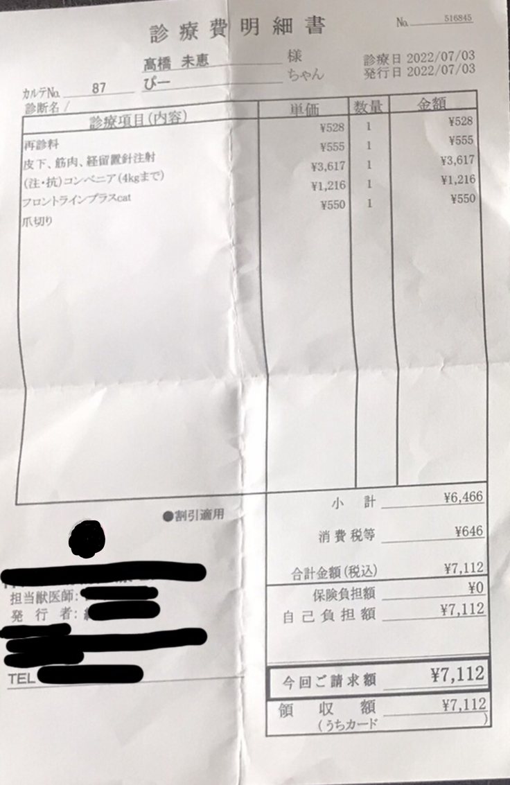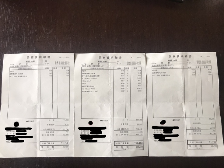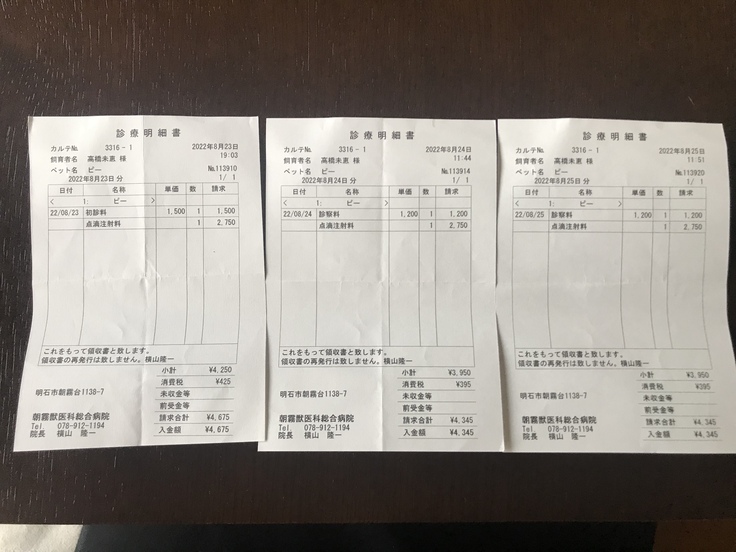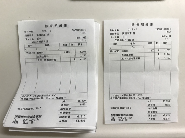 毎日の水分補給の点滴は一度の通院で4,345円かかります。2週間に一度の抗生物質、ステロイド、皮下点滴など検査費も加われば一度の通院で21,010円かかります。