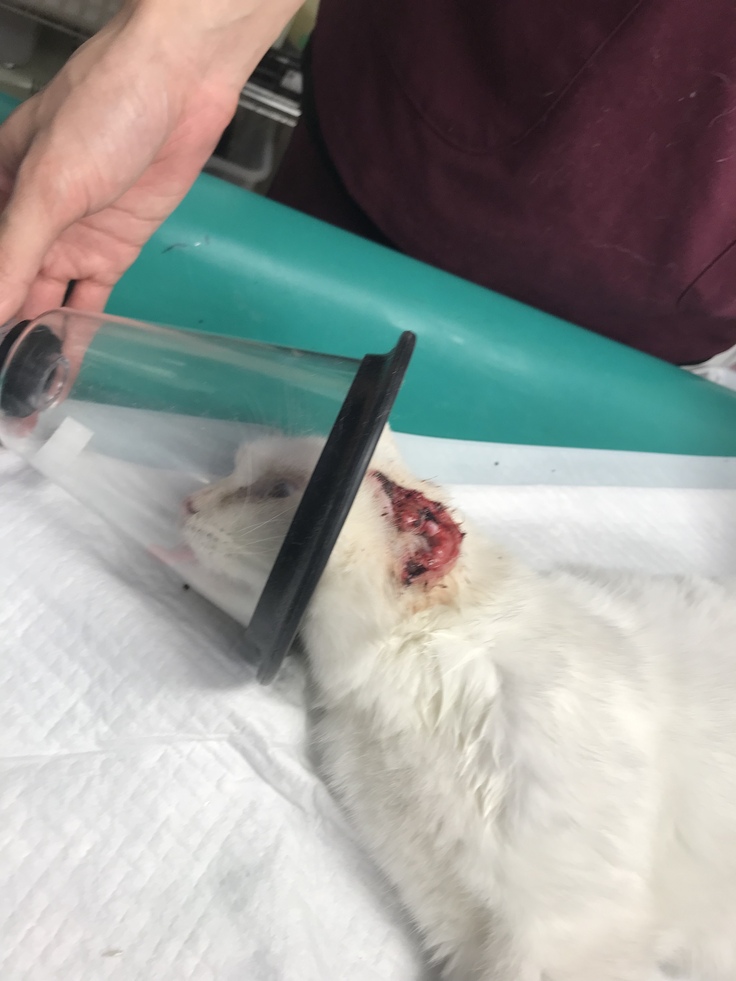 手術は無事成功したと思われたのですがお盆前くらいから耳の傷が酷くなり、目も結膜炎の様な状態になり、餌も食べにくそうになり、お盆明けにはまた病院に通う日々が始まりました。