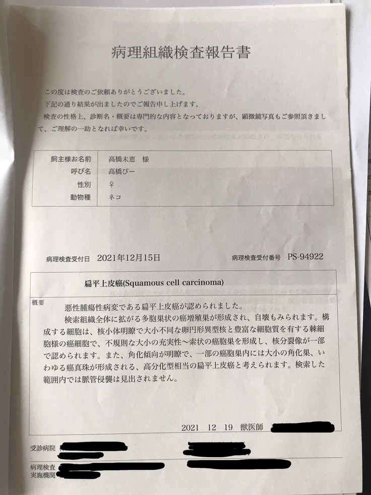 扁平上皮癌は根を深く広げてしまう癌で、手術で多く取り除いても再発する可能性の高い癌らしいです。その事は手術前から獣医師さんに聞かされていました。