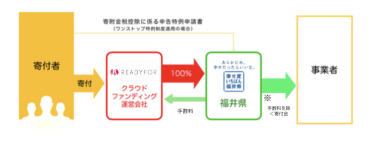 寄附金は福井県がふるさと納税として領収し、その寄附金から寄附代行手数料を除いた額を、奨励金として事業者に支給します。