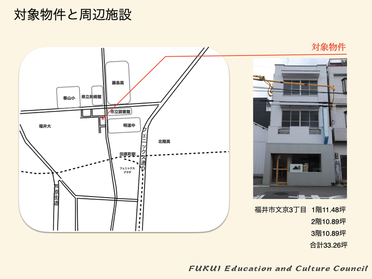 ▼プロジェクト終了要項 作品完了予定日:2023年2月末予定 対象物件所在地:福井市文京3丁目 対象物件の用途:壁面アートプロジェクト後、次世代の若者を中心に教育や文化をテーマに活動するための拠点として活用
