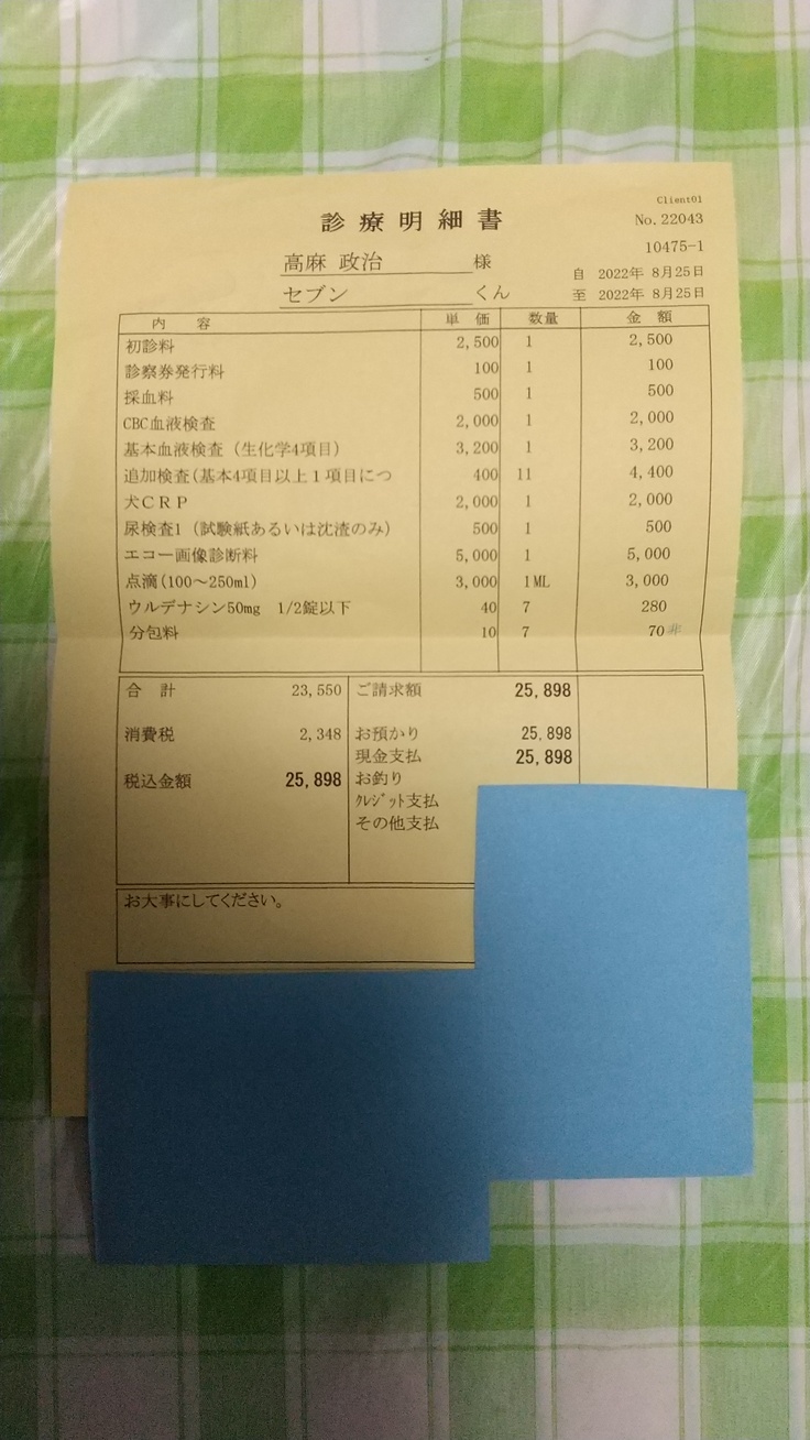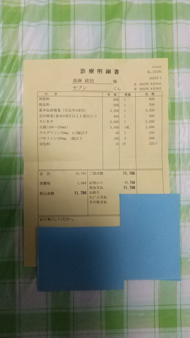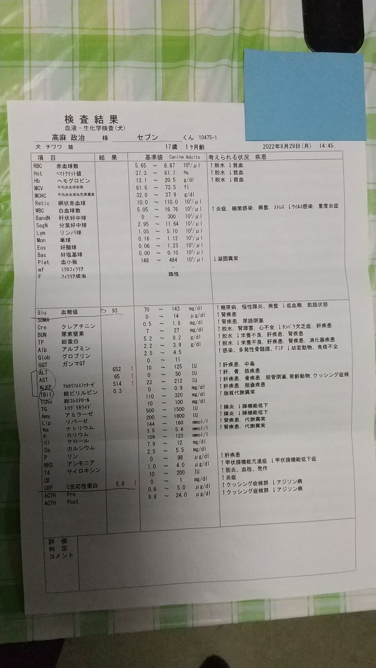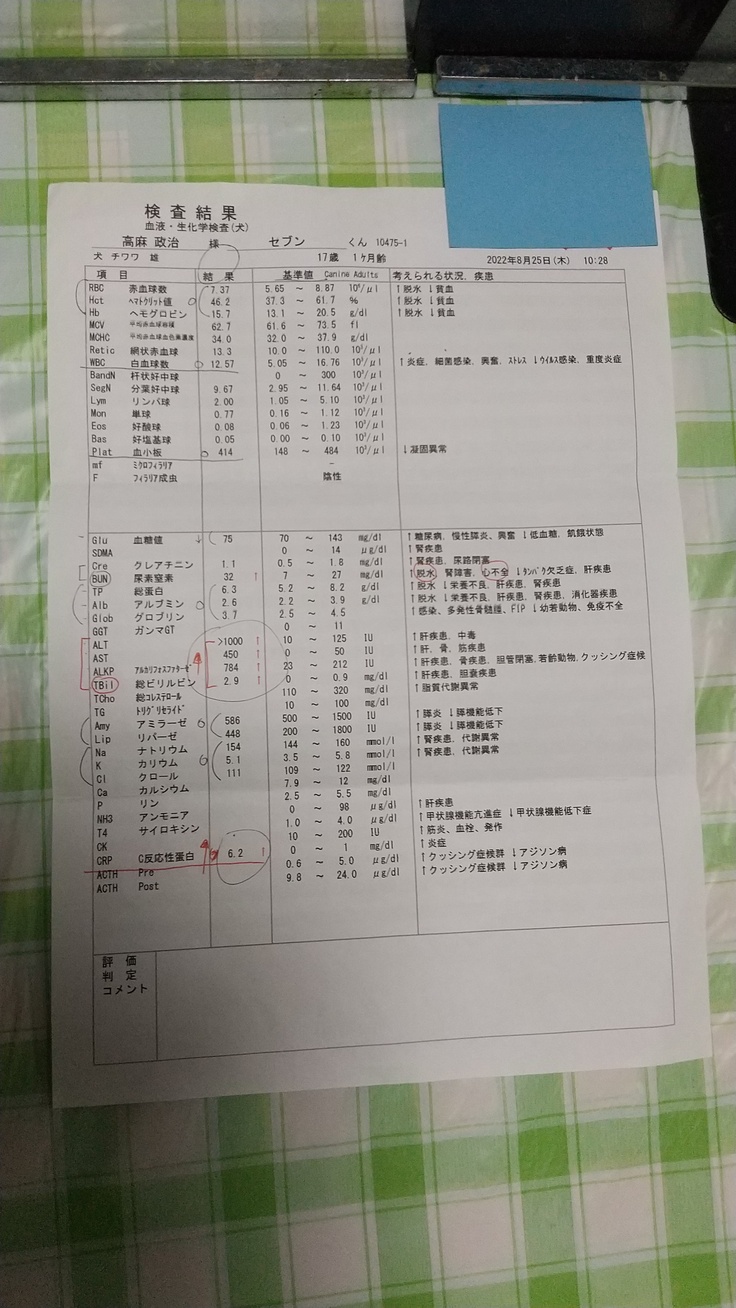 4日後に診察に行きました。少しは落ち着いたものの肝疾患と尿淡白の値が高いです、画像有り。8/29の画像。