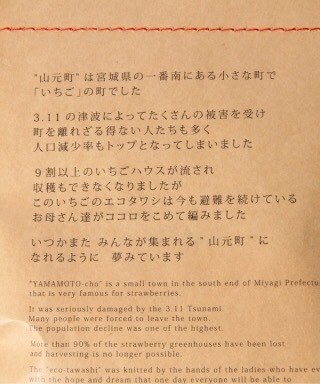 いちごエコたわしは、一つ一つが山元町のお母さんの手作りです。パッケージの裏面には作り手さんの住所とお名前が記されています。