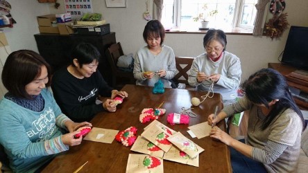 このいちごのエコたわしは、仮設住宅に住むお母さん達が仮設集合所に集まって、覚えて、手作りしてきたものです。手仕事をすることで笑顔みなり、活気づき、一歩ずつ前進できているようなきがします。とのこと