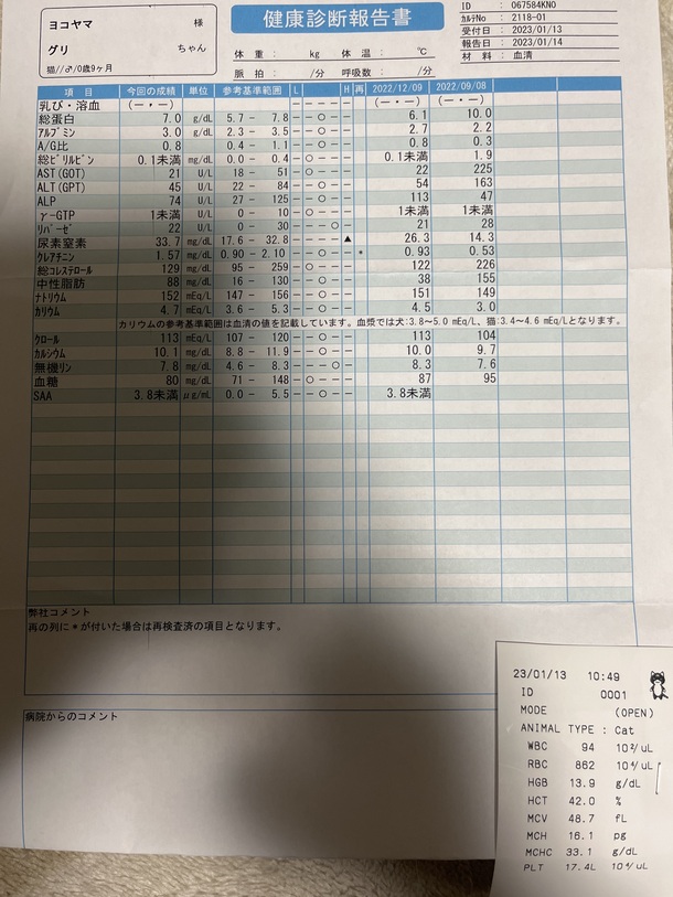 1週間まえに投薬終了後1ヶ月の検診で採血していただいた結果が外部の会社より戻り