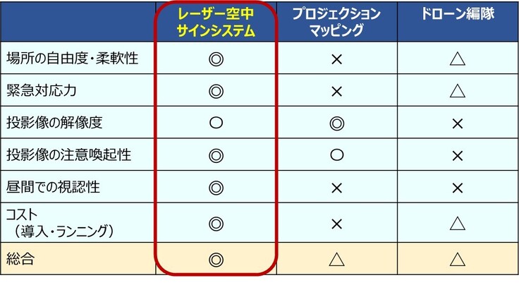 レーザー空中サインシステムはプロジェクションマッピングや、ドローンの編隊ショーなどに比べ、投影画像の内容や場所を自由に変更できるなど、イベントや催しものに対して、従来にない新たな付加価値・サービスを提供できる可能性を有しています。「必要な時」に「必要な位置」へ「望むべき内容」のサイン・画像等を提供し、人の感性を満足させるような新たな空間価値の創造に繋げることができます。