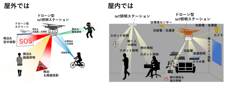 この「IoT照明ステーション」をドローンに搭載することで、空中スクリーンを検出して像を投影したり、ドローン同志での給電・通信が可能となります。さらに使い方によっては、防犯として不審者の検出や駆除、農業支援として害鳥や害虫の検出と駆除にも応用できます。
