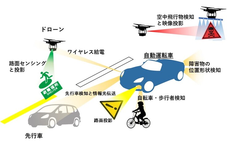 ドローンを使うことで路面の自由な場所に注意喚起表示が可能で、さらに空中スクリーンに投影することで広い範囲に注意を促すことができるため、安全社会の形成に貢献できます。