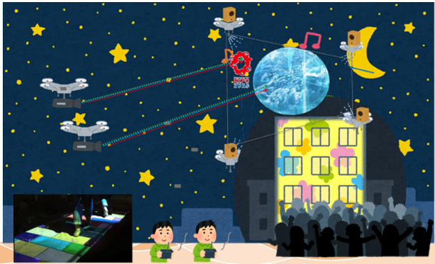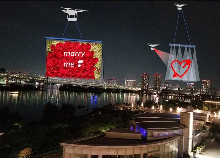 もちろんプロジェクションマッピングとのコラボレーションもドローンで移動しながら自由自在に投影できるこのシステムであれば場所を問わず可能です。