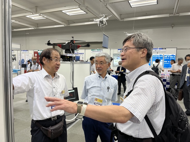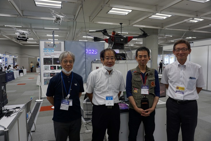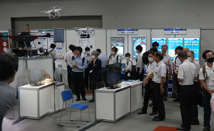 展示の内容はレーザー空中サインシステムの紹介ポスターの展示だけでなく、天井より吊り下げられた2台の小型ドローンを用いてスクリーンへの空中表示の実演、夢洲で実証実験した時の再現として大型スクリーンへの高輝度投影デモを行いました。今回同一ブースで、エアロジーラボ社の長時間飛行型の大型ドローンも同時に展示されており、今後レーザー空中サインシステムの長時間飛行化への期待を膨らませるものとなりました。