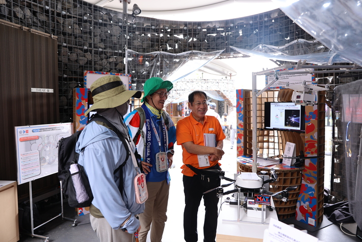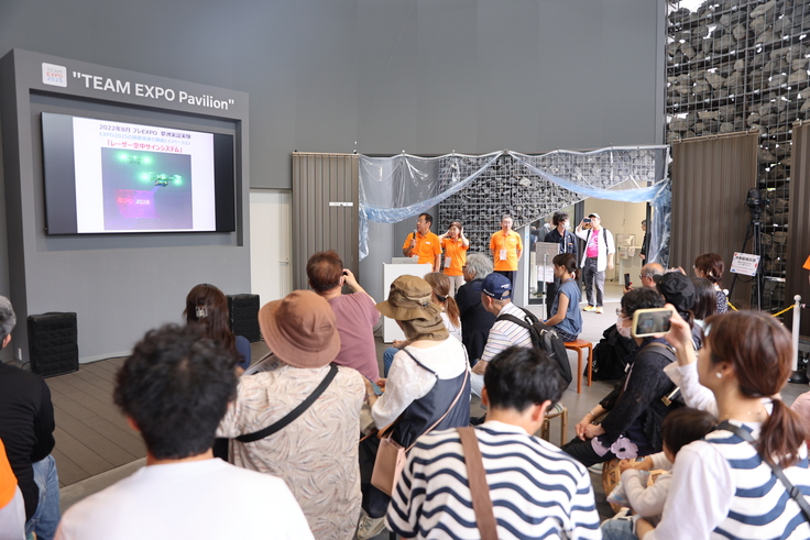 万博の目玉の木造大屋根リングのあるメイン会場から離れた西側のはずれに位置するにも関わらず、のべ200人以上の方がブースを見学され、ステージもほぼ満席状態でとても盛況でした。EXPO会場は特例のドローンショー以外ドローン飛行禁止のため実際の飛行はできませんでしたが、ドローン&レーザー技術による「安心・感動」の未来社会に関心を持っていただけたと思います。ゾーンがフ―チャーライフゾーンでもあり、お子様連れのご家族が沢山来られたことで、未来技術への期待をひしひしと感じました。