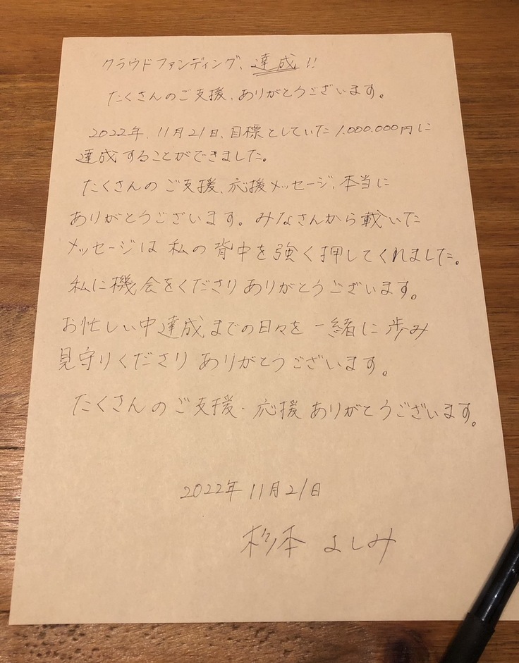 写真は見づらいですが、PCで打った字ではなく、直筆で感謝をお伝えしたく今の正直な気持ちを書きました。