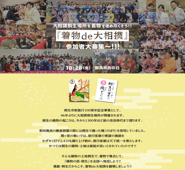 織物の町・桐生の相撲巡業を着物でお迎えして、こどもも大人も一緒に盛り上げて、楽しい時間を共有することができたら、これ以上幸せなことはありません。