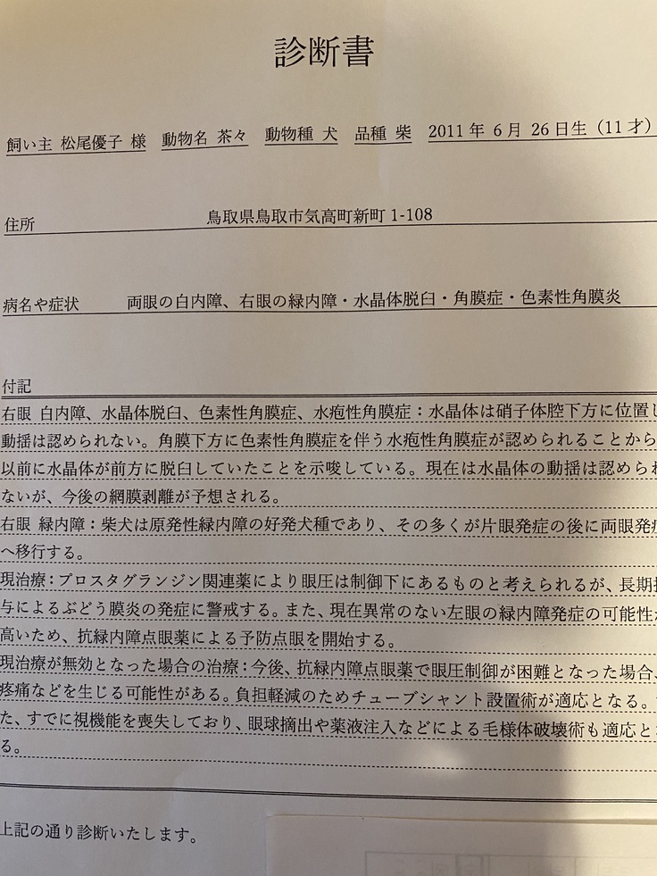 今年6月に,豆柴の茶々の右眼が,少し大きくなり、直ぐに行きつけの動物病院に受診しました。結果は右眼のレンズの異常と、白内障,緑内障の併発でした。初めは目薬で,眼圧を下げるための、処方をしていただきましたが、右眼の瞳の大きさが、全く違ってきて,右眼が大きくなり、再度受診しました。しかし、行きつけの動物病院には、治療設備が無い為、9月に急いで大学の動物病院へ受診するよう指示されました。 結果は右眼緑内障が,原因でした。大学病院で、色々検査してもらい、右眼は視野が無いといわれ、眼圧を下げる点眼と、左目も、緑内障にかかる危険性があるため、予防的に点眼が処方されました。 また急に左目の眼圧も、上がる発作が出る事があるため、その時はすぐに、点滴が必要がある事を伝えられ、左目の発作を抑えて行く必要性も、伺いました。 右眼は、既に眼球も,白濁し,眼痛もででいるとの事です。 点眼は、両目にしており、本人もストレスがあり、怒りますが、おやつで,誤魔化しながら2回/1日両目にしています。 9月2日に受診した時、右の眼圧が前回より徐々に上がっていました。今は,眼痛は酷く無いとは、思われるが、これからもっと、痛みが伴うことを、大学の動物病院のドクターに言われました。眼痛が酷くなる前に,右眼眼球摘出を勧められました。 茶々の一番楽な安楽な生活とは何か?と考えた時、痛みの無い生活ではないかと、主人と,よく話し合いました。 動物病院の先生は、手術に25万程度かかるといわれました。 私たちは、コロナのため、仕事が減り、貯蓄もありませんが、茶々の為に,できる事なら手術ができるようにと、プロジェクトに参加を決めました。 御願いします。私たちの,子供を助けて下さい。目の手術を、させてやってください。御願いします。