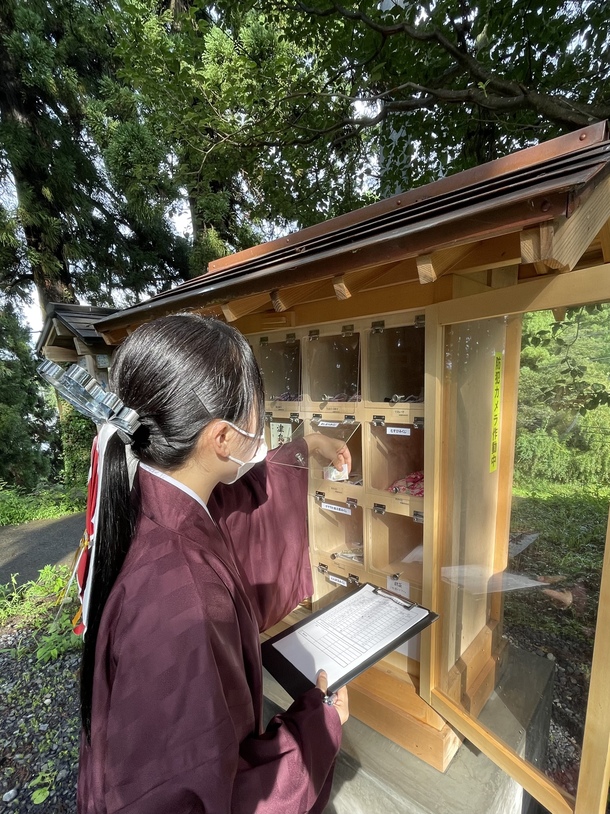 長沼フートピア公園内にある津島本宮社、境内は常に駐在する神職がいないため、毎日神社職員や地域の総代さんと交互に見回りしながら、管理しています。こちらの写真はお守り、御朱印、おみくじ、などがお受けいただけるしくみの授与品棚です。こういった収入も工事費にはかかせない収入源です。